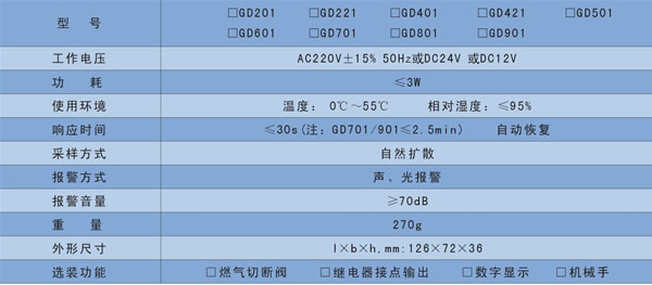 - 關(guān)鍵參數(shù):GD系列易燃、易爆及毒性氣體泄露探測(cè)器,采用高品質(zhì)氣敏元件,結(jié)合先進(jìn)電子技術(shù)及精良工藝而制成;在家庭中有燃?xì)饧岸拘詺怏w存在的地方,一旦液化石油氣、天然氣、城市煤氣、一氧化碳、氫氣等氣體的濃度達(dá)到設(shè)定預(yù)警值,GD系列氣體探測(cè)器將忠實(shí)地發(fā)出聲光報(bào)警信號(hào)