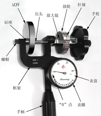 本儀器的設(shè)計(jì)符合洛氏硬度試驗(yàn)的基本定義。與臺(tái)式機(jī)的主要不同點(diǎn)是:其試驗(yàn)力的施加是通過螺桿和一個(gè)已校準(zhǔn)的彈簧完成的;用刻度表測(cè)量彈簧位移來確定試驗(yàn)力的大??;壓痕深度的測(cè)量由精密螺旋測(cè)微機(jī)構(gòu)完成,硬度值的讀取方式是透過放大鏡讀取鼓輪上的刻度線。本儀器的結(jié)構(gòu)如上圖所示