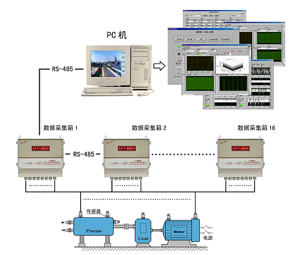 HY-1000 設(shè)備狀態(tài)在線監(jiān)測系統(tǒng)是根據(jù)工礦企業(yè)對設(shè)備進行連續(xù)監(jiān)測的需求,結(jié)合我公司在這一領(lǐng)域多年的實踐經(jīng)驗,專門開發(fā)的設(shè)備在線狀態(tài)監(jiān)測系統(tǒng),它具有安裝方便、使用靈活、性價比高的特點。其典型系統(tǒng)組成是以一臺高性能工業(yè)計算機為管理主機,采用RS-485通訊總線,與設(shè)備現(xiàn)場安裝的HY-107八通道狀態(tài)監(jiān)測數(shù)據(jù)采集儀(最多可達16臺,128通道)聯(lián)機,實現(xiàn)數(shù)據(jù)交換?,F(xiàn)場數(shù)據(jù)采集儀實現(xiàn)對傳感器輸入信號的調(diào)理及采樣,可就近安裝于需監(jiān)測的大型設(shè)備旁,系統(tǒng)布線簡潔。系統(tǒng)配備以數(shù)據(jù)庫為核心的狀態(tài)監(jiān)測、分析和管理軟件(V1.0),具有很強的數(shù)據(jù)管理及分析功能,為企業(yè)關(guān)鍵設(shè)備的運行維護提供了一種靈活、方便、可靠的現(xiàn)場解決方案。