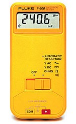 7-600 多用表可安全、自動地測量交流電壓、直流電壓、電阻和通斷性。使用簡單,是真正的“傻瓜表”。7-600“傻瓜表”的自動選擇功能使電力環(huán)境下的電壓測試變得非常簡單。在測量歐姆/通斷性時,如果輸入插孔上的電壓高于4.5V(有意或無意),多用表則會自動切換至交流或直流電壓測量功能,這取決于是交流電壓大還時直流電壓大。其輸入阻抗大約為2k歐姆,可以幫助用戶判斷電壓是來自漏泄還是硬連接。在所有測量模式下都提供過載保護(hù)。