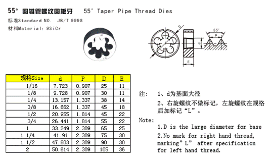 - 儀器名稱:55°圓錐管螺紋圓板牙