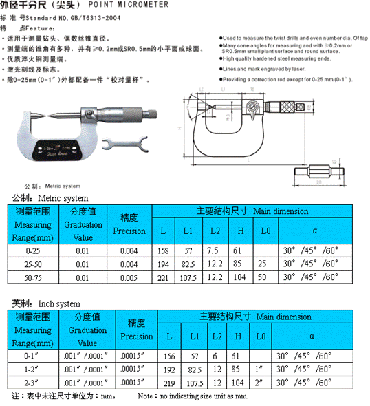 - 儀器名稱:外徑千分尺(尖頭)